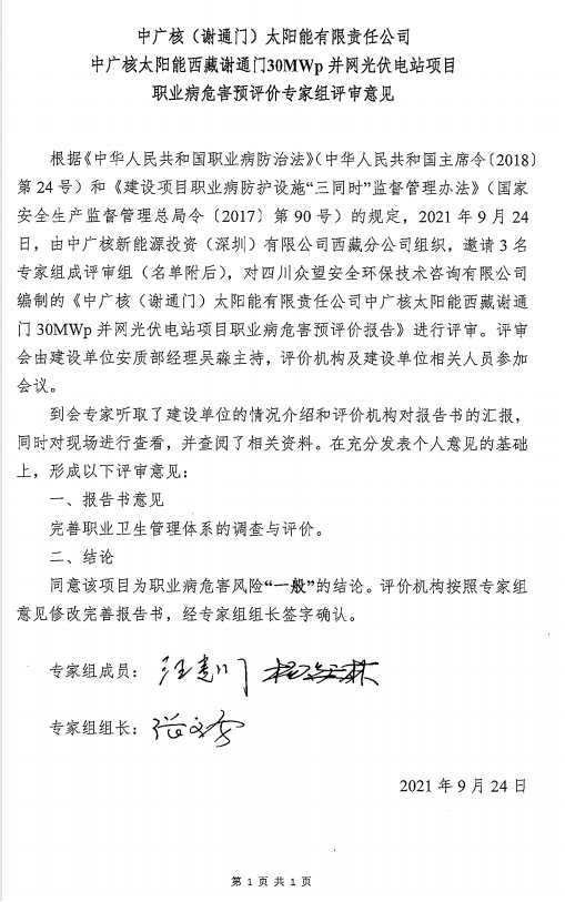 中廣核太陽能西藏謝通門30MWp并網光伏電站項目職業病危害預評價報告 |