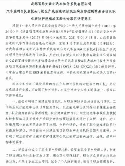 汽車座椅&儀表板&門板生產(chǎn)線改造項目職業(yè)病危害控制效果評價報告 |
