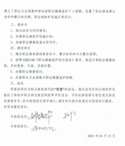根據(jù)《國民經(jīng)濟(jì)行業(yè)分類》(GBT 4754-2017)該項目屬于“汽車制造業(yè)”中的“汽車零部件及配件制造業(yè)”。根據(jù)《建設(shè)項目職業(yè)病危害風(fēng)險分類管理目錄(2012年版)》(安監(jiān)總安健第73號),“汽車制造業(yè)”屬于職業(yè)病危害較重的建設(shè)項目,結(jié)合該項目職業(yè)病危害因素的潛在危險性、接觸人數(shù)、接觸時間、職業(yè)病危害防護(hù)措施等進(jìn)行綜合分析,判定該項目屬于職業(yè)病危害“較重”的建設(shè)項目。 根據(jù)對本項目現(xiàn)場調(diào)查、職業(yè)病危害因素檢測結(jié)果和項目相關(guān)資料的綜合分析,本項目在實施過程中能夠落實有關(guān)職業(yè)病危害防護(hù)措施,在生產(chǎn)狀況正常,職業(yè)病危害防護(hù)設(shè)施正常運行的情況下,佩戴有效的個人防護(hù)用品,并根據(jù)評價機構(gòu)提出的建議進(jìn)行整改后,工人實際接觸的職業(yè)病危害因素的濃度/強度能夠控制在職業(yè)接觸限值內(nèi),符合國家有關(guān)職業(yè)衛(wèi)生標(biāo)準(zhǔn)、規(guī)范的要求。 建議: (1)根據(jù)《用人單位職業(yè)病危害告知與警示標(biāo)示管理規(guī)范》(國家安全生產(chǎn)監(jiān)督管理總局令〔2014〕第111號)的要求,完善生產(chǎn)車間職業(yè)病危害告知與警示標(biāo)示的設(shè)置。設(shè)置建議見下表。 (2)根據(jù)《職業(yè)健康監(jiān)護(hù)技術(shù)規(guī)范》(GBZ188-2014)補充石蠟煙的職業(yè)健康檢查。 (3)根據(jù)《建設(shè)單位職業(yè)健康監(jiān)護(hù)監(jiān)督管理辦法》(國家安全生產(chǎn)監(jiān)督管理總局令〔2012〕第49號)、《中華人民共和國職業(yè)病防治法》(中華人民共和國主席令〔2018〕第24號)、《職業(yè)健康監(jiān)護(hù)技術(shù)規(guī)范》(GBZ188-2014)組織人員進(jìn)行復(fù)查,對禁忌癥人員進(jìn)行調(diào)崗并進(jìn)行崗前職業(yè)健康檢查; (4)縮短噪聲崗位作業(yè)時間或配發(fā)個體防護(hù)用品,并現(xiàn)場監(jiān)管。 (5)建設(shè)單位車間內(nèi)設(shè)置飲水休息區(qū)與生產(chǎn)區(qū)隔離,避免受到生產(chǎn)區(qū)化學(xué)物質(zhì)污染。 |