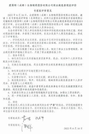 愛斯特(成都)生物制藥股份有限公司職業病危害現狀評價 |