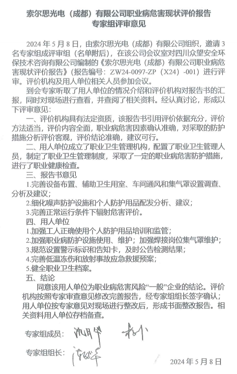 索爾思光電(成都)有限公司職業(yè)病危害現(xiàn)狀評價 |