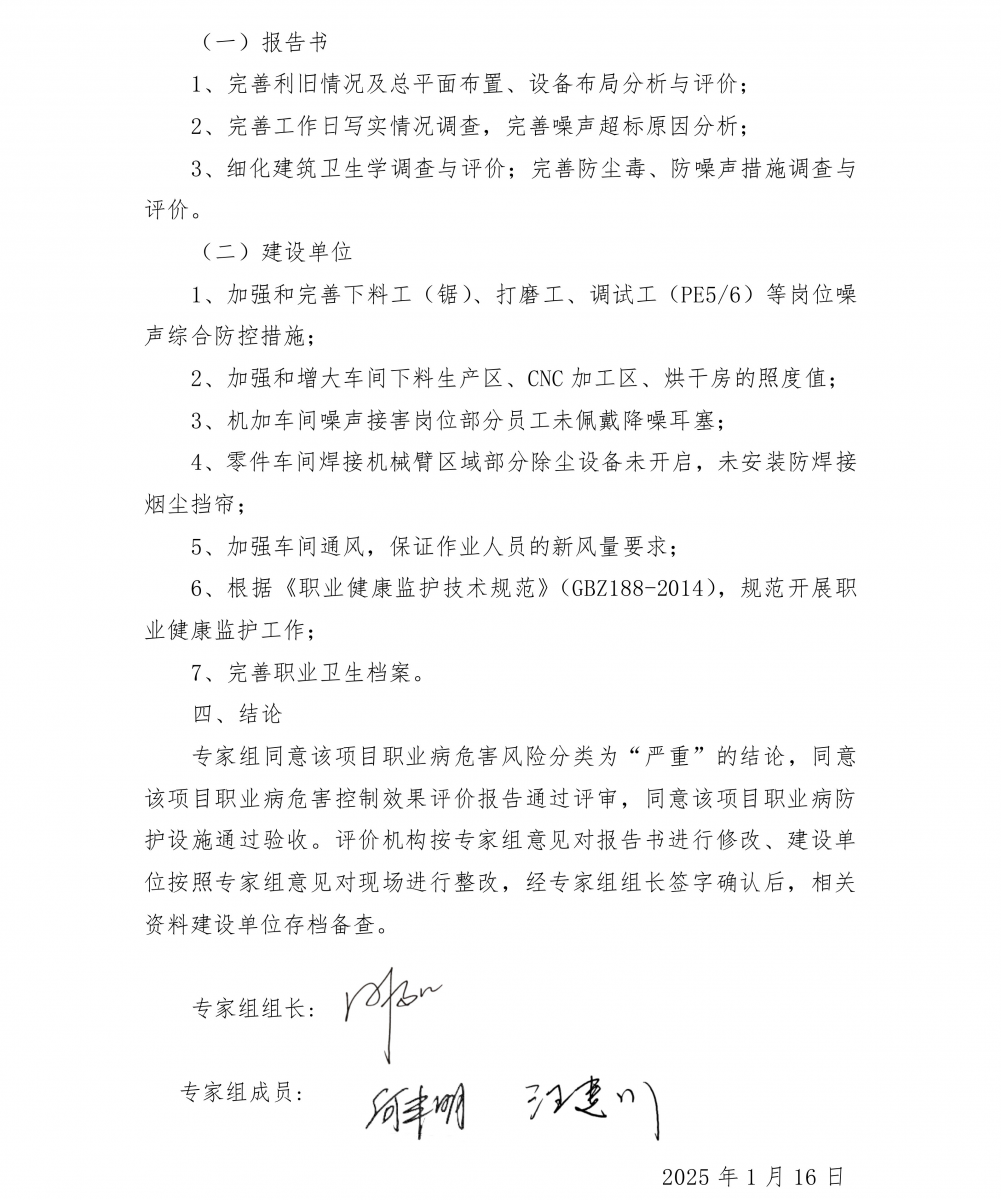 結(jié)論:項目控制效果評價判定為“職業(yè)病危害風(fēng)險分類嚴(yán)重”的建設(shè)項目。 根據(jù)對本項目現(xiàn)場調(diào)查、職業(yè)病危害因素檢測結(jié)果和項目相關(guān)資料的綜合分析,本項目職業(yè)衛(wèi)生防治工作符合國家法律、法規(guī)的相關(guān)規(guī)定,采取的職業(yè)病防治措施基本可行,日常運行過程中在一定程度上能控制和降低職業(yè)病危害因素對作業(yè)人員健康的影響,項目在落實了本次評價報告提出的補充措施和建議后,能夠滿足職業(yè)病防治工作的需要。本項目已具備職業(yè)病防護設(shè)施竣工驗收的條件。 建議: (1)車間加強通風(fēng)要求,保證作業(yè)人員的新風(fēng)量要求。 (2)根據(jù)《職業(yè)健康監(jiān)護技術(shù)規(guī)范》(GBZ188-2014)結(jié)合項目實際情況,做好健康監(jiān)護工作,“兩檔”管理制度。“兩檔”內(nèi)容包括職業(yè)衛(wèi)生檔案和職業(yè)健康監(jiān)護檔案。 (3)按照《用人單位職業(yè)健康監(jiān)護監(jiān)督管理辦法》(國家安監(jiān)總局令〔2012〕第49號)、《職業(yè)健康監(jiān)護技術(shù)規(guī)范》(GBZ188-2014)相關(guān)規(guī)定對新進或調(diào)崗作業(yè)人員進行崗前體檢、并對離崗或調(diào)離作業(yè)人員進行離崗健康檢查。 (4)建設(shè)單位應(yīng)按照《工作場所職業(yè)衛(wèi)生管理規(guī)定》(國家衛(wèi)生健康委員會令〔2020〕第5號)的規(guī)定:職業(yè)病危害嚴(yán)重的用人單位,應(yīng)當(dāng)委托具有相應(yīng)資質(zhì)的職業(yè)衛(wèi)生技術(shù)服務(wù)機構(gòu),每年至少進行一次職業(yè)病危害因素檢測,每三年至少進行一次職業(yè)病危害現(xiàn)狀評價。檢測、評價結(jié)果應(yīng)當(dāng)存入本單位職業(yè)衛(wèi)生檔案,并向衛(wèi)生健康主管部門報告和勞動者公布。 (5)建設(shè)單位應(yīng)根據(jù)《職業(yè)病危害項目申報辦法》(國家安全生產(chǎn)監(jiān)督管理總局令第48號)的規(guī)定,將此次控制效果評價報告與職業(yè)病危害因素現(xiàn)場檢測結(jié)果向當(dāng)?shù)刂鞴懿块T進行申報。 (6)根據(jù)《國家衛(wèi)生健康委辦公廳關(guān)于進一步加強用人單位職業(yè)健康培訓(xùn)工作的通知》國衛(wèi)辦職健函〔2022〕441號的要求進行職業(yè)衛(wèi)生培訓(xùn)。 (7)定期對除塵、廢氣處理設(shè)施進行檢查、維護,發(fā)現(xiàn)有堵塞、損壞或其他原因?qū)е虏荒苷9ぷ鞯模瑧?yīng)及時進行清理、設(shè)備維修,并做好相關(guān)維護保養(yǎng)記錄。 (8)加強噪聲作業(yè)人員的個體防護和職業(yè)健康監(jiān)護。 (9)加強外委作業(yè)人員的職業(yè)衛(wèi)生管理,對焊工、打磨工加強個體防護和職業(yè)健康監(jiān)護。 (10)建設(shè)單位應(yīng)加強女工的勞動保護,不得安排孕期、哺乳期的女職工從事對本人和胎兒、嬰兒有危害的作業(yè)。 (11)應(yīng)急救援物資的使用人員,應(yīng)接受相應(yīng)的培訓(xùn),熟悉裝備的用途、技術(shù)性能及有關(guān)使用說明資料,并遵守操作規(guī)程;及時對車間內(nèi)配備的應(yīng)急救援藥箱進行檢查,對應(yīng)急救援藥品進行有效性查驗,及時補充更換。 (12)粉塵防爆措施嚴(yán)格以安全評價報告、安全設(shè)施設(shè)計專篇提出的措施為準(zhǔn)。 (13)針對維修、清污存在的受限空間作業(yè)危害,應(yīng)加強受限空間作業(yè)監(jiān)管,嚴(yán)格按照《缺氧危險作業(yè)安全規(guī)程》(GB8958-2006)、《密閉空間作業(yè)職業(yè)危害防護規(guī)范》(GBZ/T205-2007)進行作業(yè)。 (14)本次職業(yè)病危害控制效果評價只針對目前生產(chǎn)狀況,公司今后遇單位名稱、法定代表人或者負責(zé)人發(fā)生變更,須按時申報;或因技術(shù)、工藝或原輔材料發(fā)生改變而引起職業(yè)病危害因素發(fā)生變化時,應(yīng)進一步進行職業(yè)病危害因素評價。 |