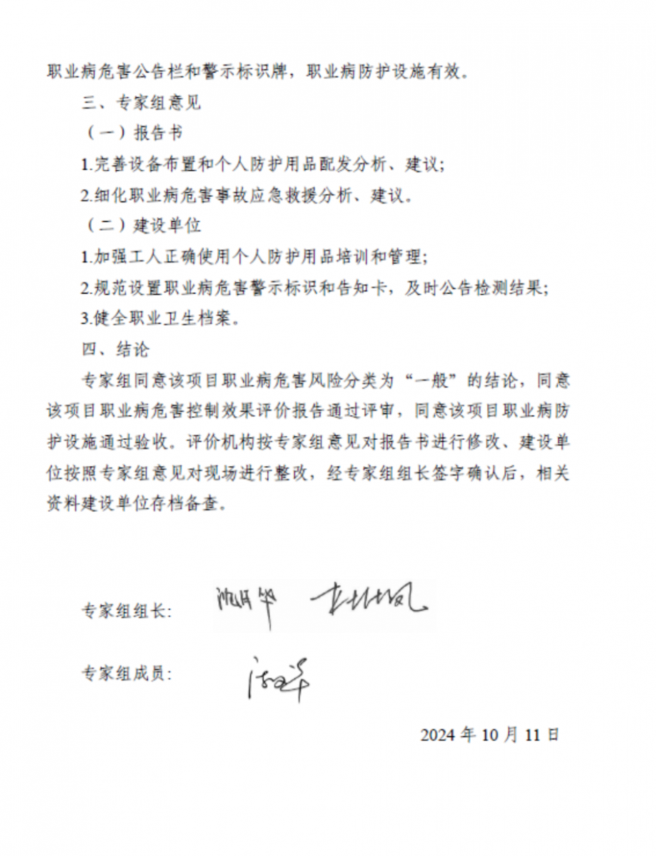 評(píng)價(jià)結(jié)論:根據(jù)對(duì)本項(xiàng)目現(xiàn)場(chǎng)調(diào)查、職業(yè)病危害因素檢測(cè)結(jié)果和項(xiàng)目相關(guān)資料的綜合分析,本項(xiàng)目當(dāng)前(試運(yùn)行階段)基本符合國(guó)家和地方對(duì)職業(yè)病防治方面法律、法規(guī)、標(biāo)準(zhǔn)的要求,本項(xiàng)目已具備職業(yè)病防護(hù)設(shè)施竣工驗(yàn)收的條件。在生產(chǎn)狀況正常,職業(yè)病危害防護(hù)設(shè)施運(yùn)行有效,工人佩戴合理有效的個(gè)體防護(hù)用品,其實(shí)際接觸的職業(yè)病危害因素的濃度/強(qiáng)度能夠控制在職業(yè)接觸限值內(nèi),且采取了控制效果評(píng)價(jià)報(bào)告所提對(duì)策措施和建議的情況下,符合國(guó)家和地方對(duì)職業(yè)病防治方面法律、法規(guī)、標(biāo)準(zhǔn)的要求。 建議: 1.1職業(yè)衛(wèi)生管理 1、該項(xiàng)目應(yīng)定期委托有資質(zhì)的檢測(cè)機(jī)構(gòu)對(duì)工作場(chǎng)所內(nèi)職業(yè)病危害因素進(jìn)行一次定期檢測(cè),并對(duì)每次職業(yè)病危害因素檢測(cè)結(jié)果公示。 2、用人單位外委具有職業(yè)病危害的作業(yè)時(shí),應(yīng)書(shū)面告知給承包商工作場(chǎng)所存在的職業(yè)病危害以及相關(guān)要求,并采取措施達(dá)到防護(hù)條件,或配備個(gè)人職業(yè)病防護(hù)用品。 3、定期對(duì)在崗期間的勞動(dòng)者進(jìn)行職業(yè)衛(wèi)生培訓(xùn),根據(jù)實(shí)際情況制定培訓(xùn)計(jì)劃,確定培訓(xùn)周期。做好記錄及存檔工作。 4、本項(xiàng)目竣工驗(yàn)收后,建設(shè)單位應(yīng)按照本報(bào)告書(shū)識(shí)別的職業(yè)病危害因素進(jìn)行申報(bào)。 5、該用人單位在作業(yè)場(chǎng)所設(shè)置了完善的警示標(biāo)識(shí),今后每半年至少應(yīng)對(duì)其進(jìn)行一次檢查,發(fā)現(xiàn)有破損、脫落、褪色、變形等不符合要求時(shí),應(yīng)按照《工作場(chǎng)所職業(yè)病危害警示標(biāo)識(shí)》(GBZ158-2003)相關(guān)規(guī)定進(jìn)行修整更換。 1.2個(gè)人防護(hù)用品 用人單位應(yīng)當(dāng)進(jìn)一步完善個(gè)人防護(hù)用品的發(fā)放周期及使用監(jiān)管內(nèi)容,加強(qiáng)作業(yè)人員防護(hù)用品佩戴監(jiān)督,定期更換防護(hù)用品。 1.3職業(yè)健康監(jiān)護(hù) 該項(xiàng)目生產(chǎn)作業(yè)人員體檢因素還需進(jìn)一步完善,將視屏作業(yè)納入職業(yè)健康體檢范疇。建議建設(shè)單位按照《職業(yè)健康監(jiān)護(hù)技術(shù)規(guī)范》(GBZ188-2014)相關(guān)規(guī)定,組織接觸職業(yè)病危害因素的作業(yè)人員到具有職業(yè)健康體檢資質(zhì)的醫(yī)院進(jìn)行在崗期間職業(yè)健康體檢,對(duì)新進(jìn)員工進(jìn)行崗前體檢,對(duì)離崗人員進(jìn)行離崗體檢。 建設(shè)單位應(yīng)按《中華人民共和國(guó)職業(yè)病防治法》中華人民共和國(guó)主席令〔2018〕第24號(hào)和《職業(yè)健康監(jiān)護(hù)技術(shù)規(guī)范》(GBZ188-2014)相關(guān)規(guī)定全面履行職業(yè)健康監(jiān)護(hù)工作,對(duì)新進(jìn)作業(yè)人員進(jìn)行崗前體檢、并對(duì)離崗或調(diào)離作業(yè)人員進(jìn)行離崗健康檢查,根據(jù)體檢結(jié)果對(duì)作業(yè)人員按照《職業(yè)病防治法》等法律法規(guī)進(jìn)行合理處置。 1.4外包作業(yè)建議 1、督促外包單位安排本項(xiàng)目維護(hù)檢修人員完善職業(yè)健康體檢項(xiàng)目。 2、對(duì)外包單位維護(hù)檢修作業(yè)勞動(dòng)過(guò)程中職業(yè)病防護(hù)設(shè)施使用情況和個(gè)人防護(hù)用品佩戴進(jìn)行監(jiān)督。 1.5應(yīng)急救援建議 該項(xiàng)目存在六氟化硫急性中毒、職業(yè)中暑、一氧化碳急性中毒,建議建設(shè)單位進(jìn)行六氟化硫急性中毒、一氧化碳急性中毒、職業(yè)中暑應(yīng)急演練并加強(qiáng)應(yīng)急救援防護(hù)。
