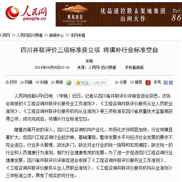 人民網成都4月5日電 (宋艷)近日,記者從四川省并聯評價評審促進會獲悉,該協會申報的《工程咨詢并聯評價服務業工作準則》、《工程咨詢并聯評價服務從業人員職業準則》、《工程咨詢并聯評價服務機構從業準則》等三項標準在四川省質量技術監督局獲得立項,成功完成后,將填補行業標準空白。