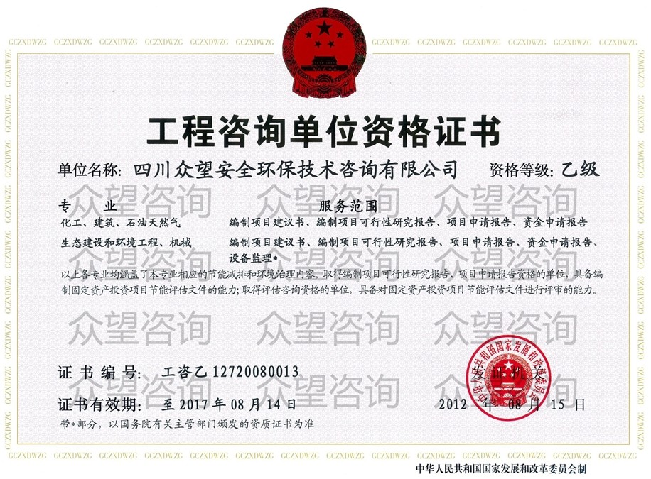 本公司于2012年取得工程咨詢乙級資質(zhì),現(xiàn)有注冊咨詢工程師23人,可以從事化工、建筑、機械、石油天然氣、生態(tài)建設(shè)和環(huán)境工程5個行業(yè)的節(jié)能評估、可行性研究報告、項目申請報告、資金申請報告編制工作。近兩年,